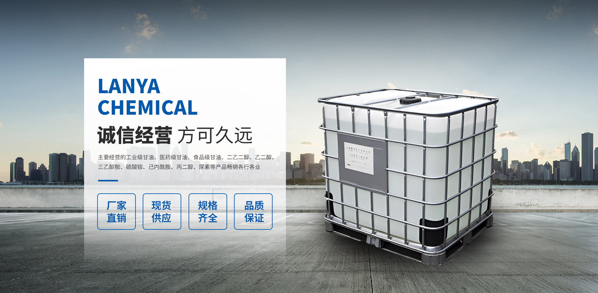 常州藍亞新材料科技有限公司是一家集技術研發、技術服務、生產加工、經銷批發為一體的化工經營企業,擁有完整、科學的質量管理體系,以雄厚的實力、低廉的價格,優良的服務與多家企業建立了長期的合作關系。我們有很廣泛的商品信息網絡,合作伙伴遍及世界各地,我們在“質量為先”的經營理念指導下,經過全體員工的不懈努力,以經取得了令人矚目的成績,并擁有一支業務精通、操作能力強的骨干隊伍。公司實力雄厚,重信用、守合同、保證產品質量,產品品種齊全、價格合理,以多品種經營特色和薄利多銷的原則,贏得了廣大客戶的信任。  藍亞化工,主要經營的工業級甘油、醫藥級甘油、食品級甘油、二乙二醇、乙二醇、三乙醇胺、硫酸銨、己內酰胺、丙二醇、尿素等產品暢銷各行各業,在各大企業當中享有較高的地位。公司與多家加工廠、零售商和代理商建立了長期穩定的合作關系。本公司的二乙二醇、工業級甘油、三乙醇胺等液體散裝有機化學品品種齊全、價格合理,廣泛用于各行各業。  公司位于目前中國具活力的長江三角洲地區有發展潛力的城市—常州,地理位置得天獨厚,水陸交通便利。